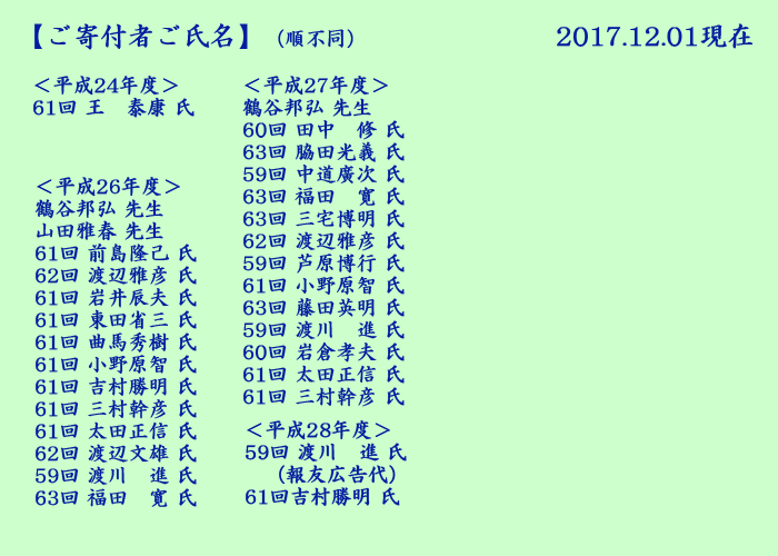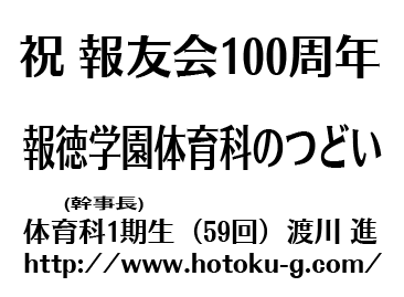 | 訃報:本幹事代表第59回生 渡川 進氏 令和6年3月8日(金)永眠 本活動はコロナ禍によって休止状態でしたが、 再開の見込みが立たないため、「報徳学園体育科のつどい」は解散とさせて頂きます。 会員皆様方によって支えて頂き、誠にありがとうございました。お礼申し上げます。 なお、このWebサイトは2026年4月20日を持って閉鎖いたします。 |